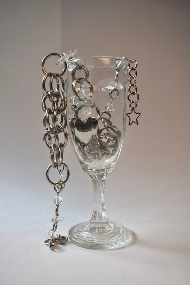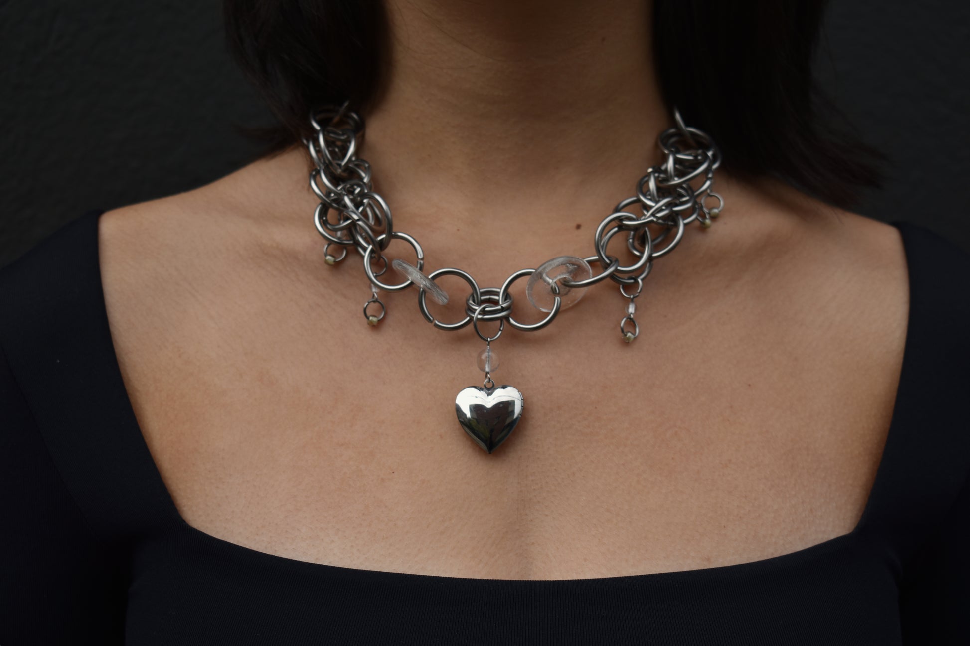 the thawing heart necklace progresses from widely-spaced clear beads on either end, to chainmail with little dangly bead "drips," to a locket-and-clear-bead centerpiece. she tells a story!