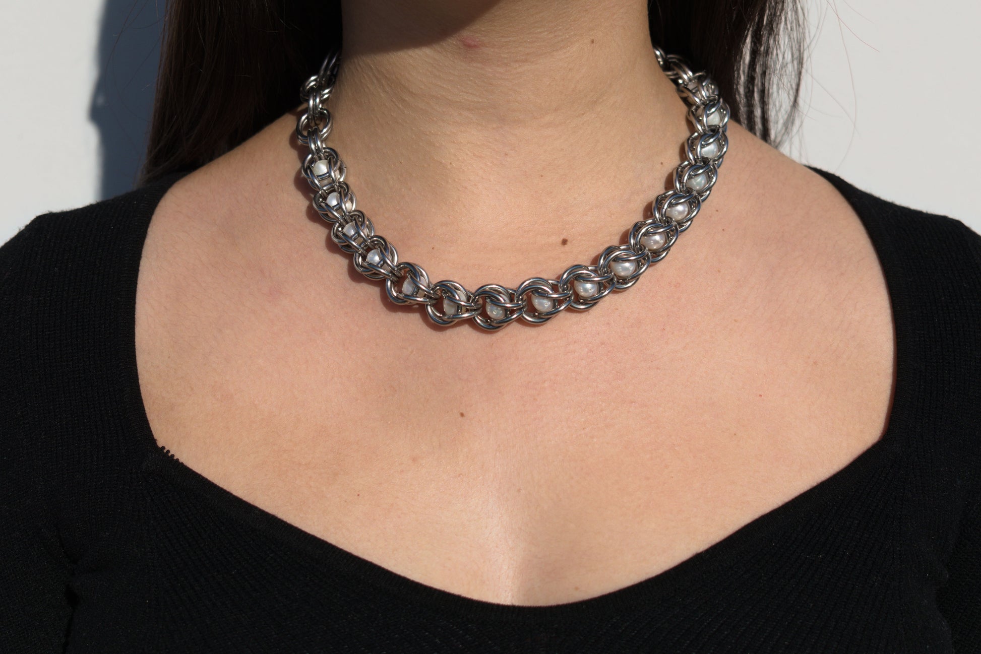 material details: stainless steel and repurposed pearl bead necklace with a fish hook clasp. 15.75-19.5 in adjustable length. chainmail by junk mail jewelry.