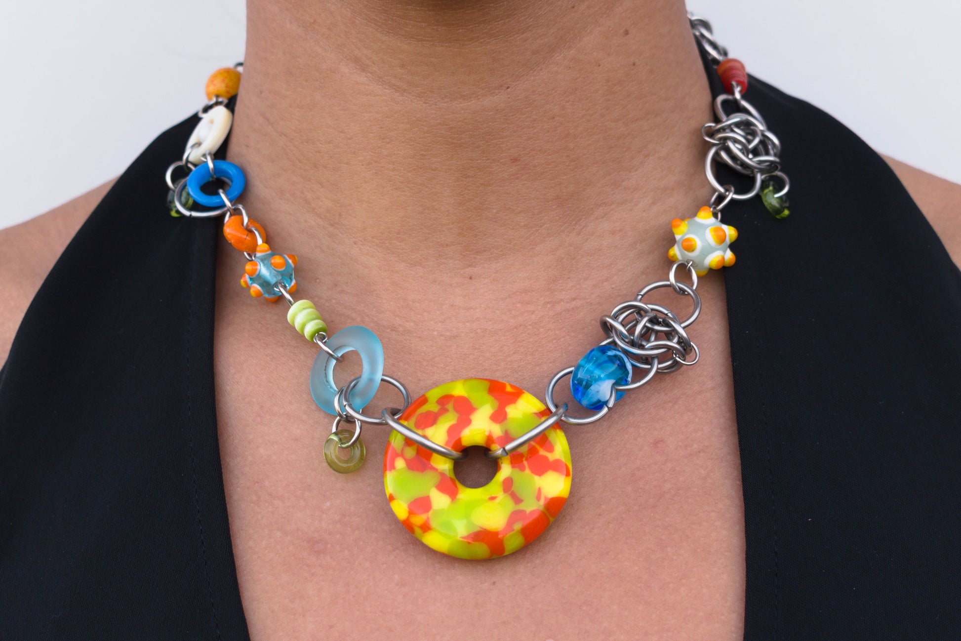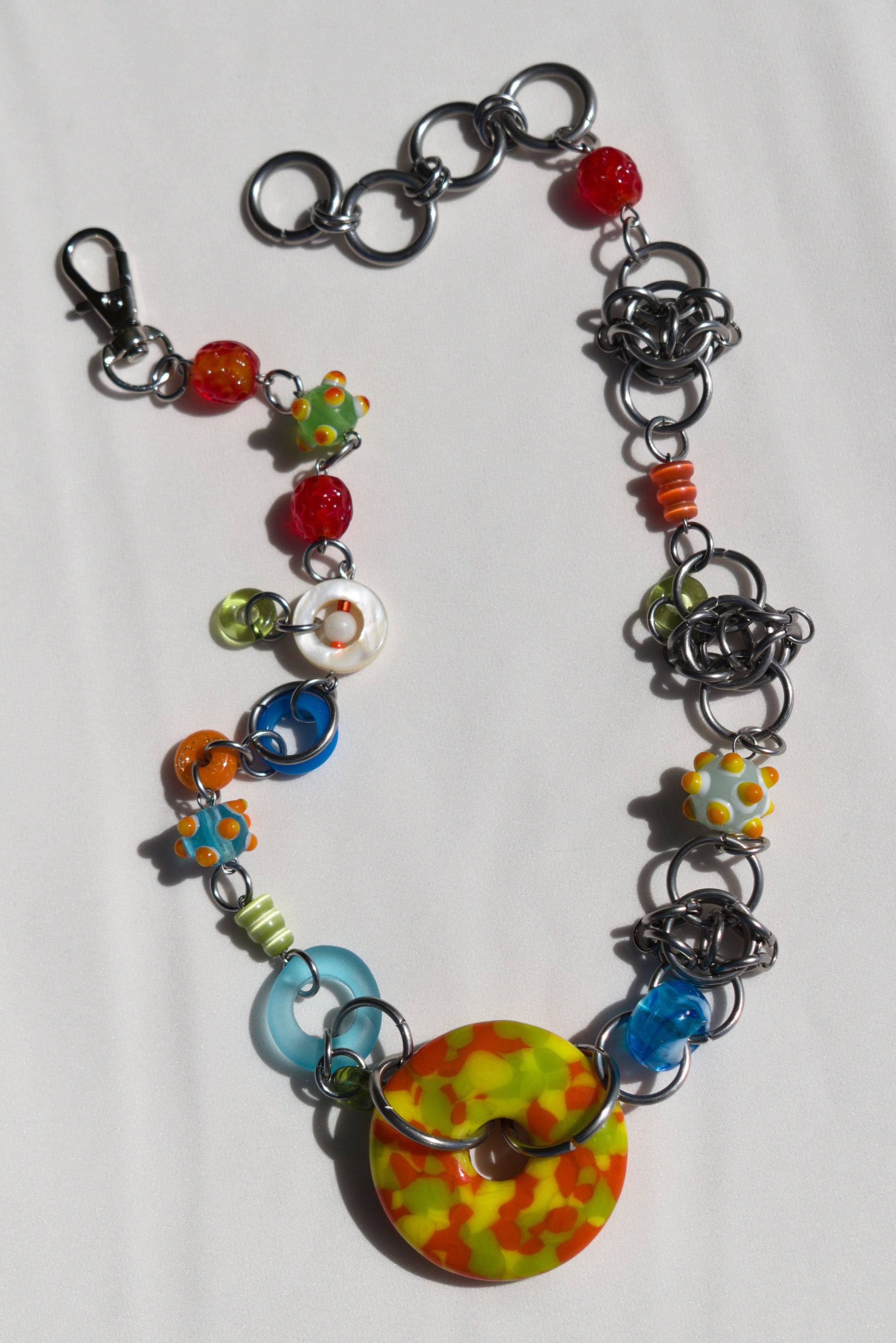 i knew i needed to make a necklace with this color palette when i found this huge donut bead! she's a star! spiky beads and bright colors match the statement bead's craziness. to be totally honest i have an urge to eat pretty much every bead on this necklace, hence the name. i feel like they'd be sour.